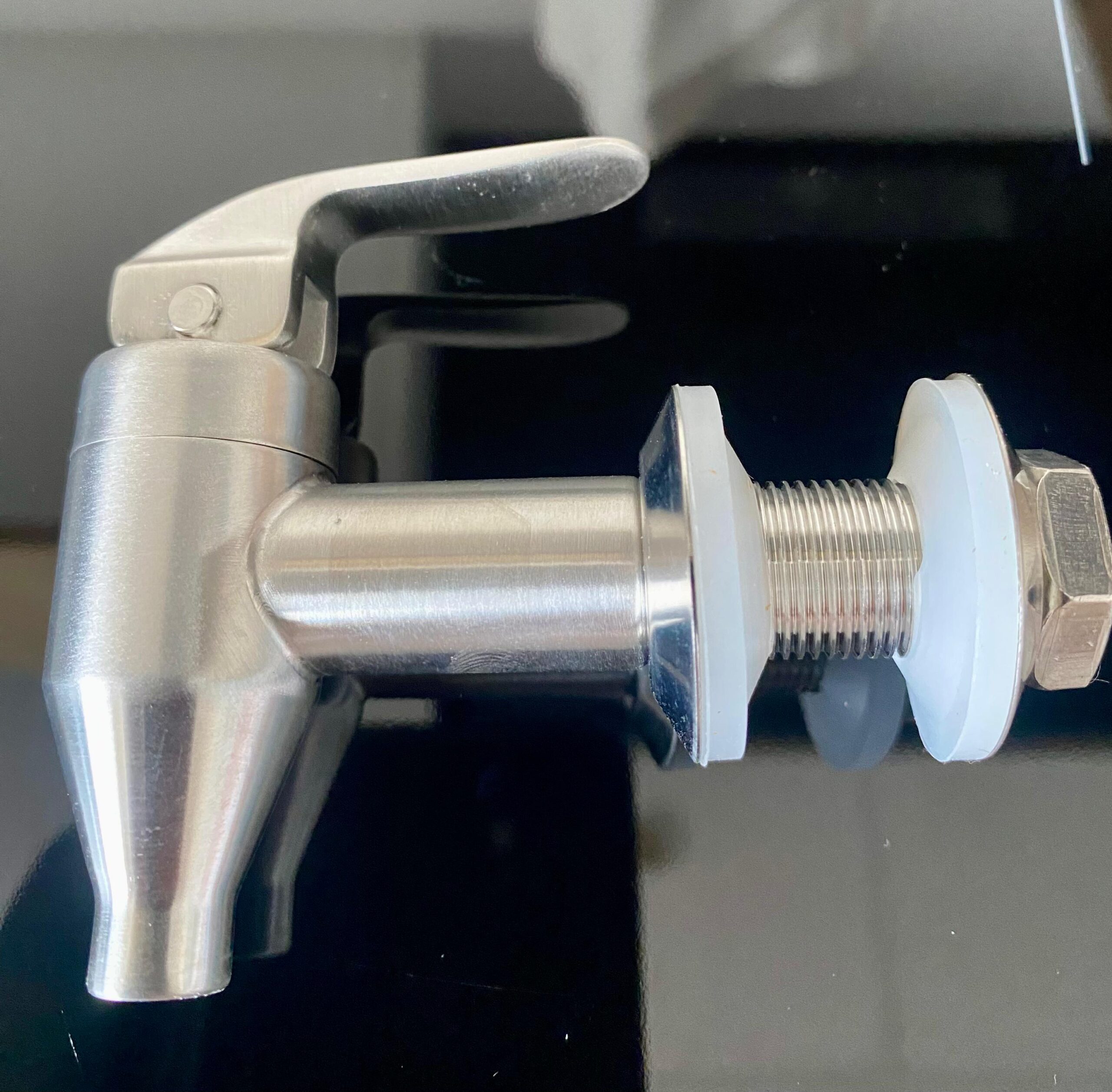 Ce robinet de distributeur de boissons en acier inoxydable est livré avec ses accessoires : 2 rondelles en silicone, 2 rondelles en acier inoxydable et un écrou en acier inoxydable.